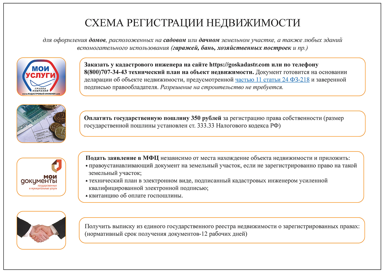 Жилые/садовые дома (бани, гаражи и иные постройки), расположенные вне границ населенных пунктах, в садовых, дачных товариществах (СНТ), на землях для садоводства, дачного строительства. До 01 января 2017 года для регистрации данных объектов необходимо было заполнить декларацию об объекте недвижимого имущества установленного образца, приложить к ней госпошлину и правоустанавливающий документ на земельный участок и подать все это в Росреестр, затем органы Росреестра автоматически сами ставили на кадастровый учет, вы только регистрировали право собственности-иными словами порядок регистрации права собственности на данные объекты был прост, действовал упрощенный порядок. С вступлением в силу Федерального закона №218-ФЗ от 13.07.2015г. "О государственной регистрации недвижимости" для регистрации права собственности такие объекты сначала необходимо поставить на кадастровый учет, а уж затем зарегистрировать право собственности на такие объекты. Основанием для постановки на кадастровый учет вышеуказанных объектов с 01 января 2017г. является технический план, который подготавливается только аттестованными кадастровыми инженерами с обязательным выездом на объект. Как мы видим порядок регистрации права собственности на такие объекты достаточно усложнился.